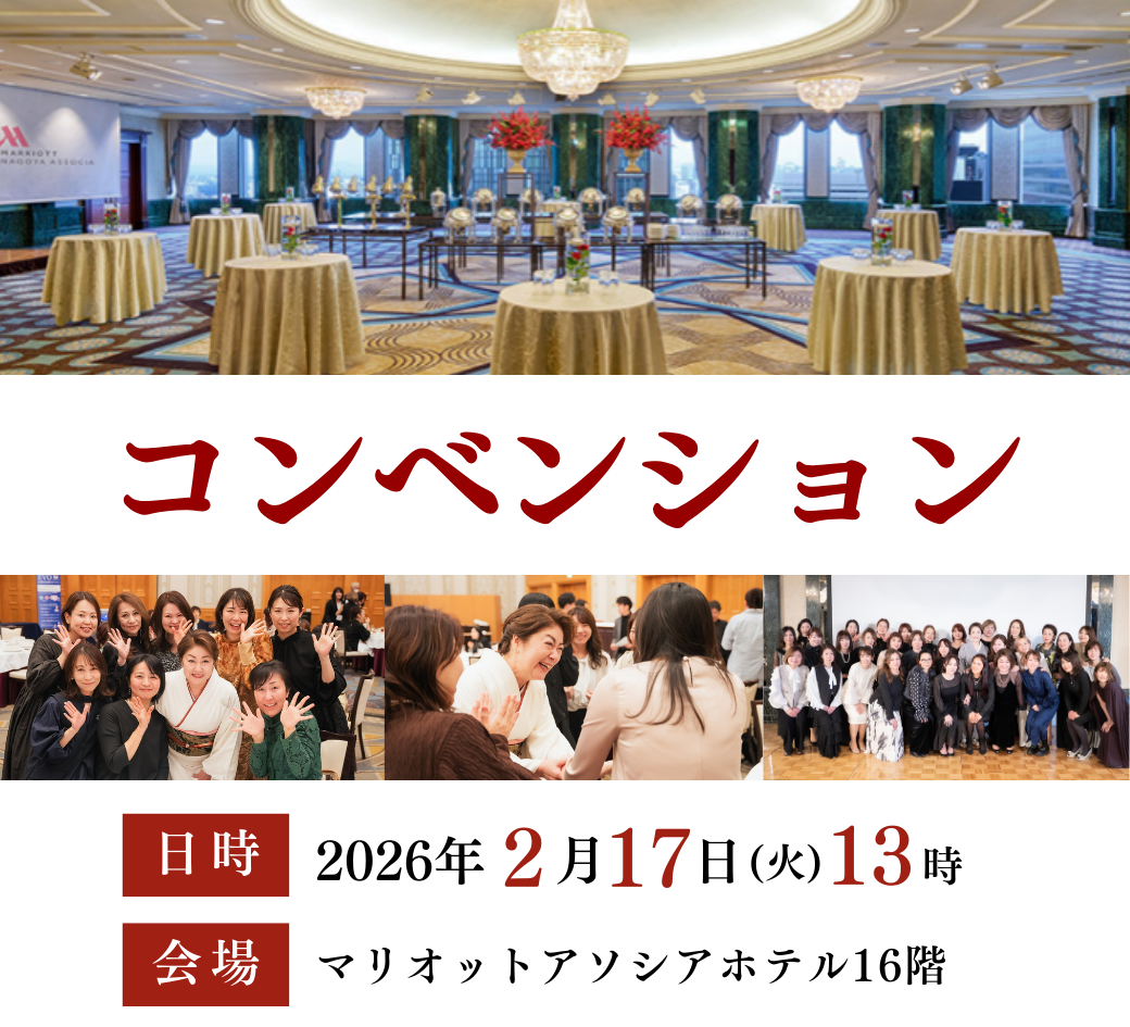 この度、ハンドセラピス美容学院では「第6回コンベンション」を開催する運びとなりました。これまで多くの方が本技術を通じて心身の在り方を見つめ直し、新たな人生の歩みを始められました。今後もこの価値を広く普及し、社会に貢献できる技術として発展させていく所存です。サロン運営に役立つ教育体制の強化や、認知向上に向けた取り組みも一層拡充してまいります。ご多用中恐縮ではございますが、ご臨席賜れば幸甚に存じます。ハンドセラピス美容学院代表取締役 福留 清美 ハンドセラピス美容学院 第6回 コンベンション ハンドセラピス美容学院第6回 コンベンション 日時2026年2月17日(火)第一部:13時~16時(発表・表彰) 第二部:17時~19時(懇親会)会場名古屋マリオットアソシアホテル16階 「アゼリア」愛知県名古屋市中村区名駅1丁目1−4 JRセントラルタワーズ 服装セミフォーマル 会費6,600円(税込)支払方法下記申込フォームからお申込み後に表示されるページ、または自動返信メールに記載された方法でお支払いください。申込期限2026年1月19日(月)まで※限定100名様となっておりますので、先着順とさせていただきます。備考 ※キャンセルについて2026年1月19日(月)17時までにお申し出があった場合はキャンセル手続きを承ります。それ以降のキャンセルにつきましてはお受け出来かねますので、何卒ご理解いただきますようよろしくお願い申し上げます。 第6回コンベンション申込フォーム 必須会社名・サロン名 必須郵便番号 必須住所1 必須住所2 必須電話番号 必須メールアドレス 必須参加内容 参加者様お一人につき6,600円をお支払いいただきます。 第1部、第2部とも参加する第1部のみ参加する 必須参加者お名前 代表者社員スタッフその他 二人目を追加しない二人目を追加する ---------------------------------------------------- お名前(二人目) 社員スタッフその他 三人目を追加しない三人目を追加する ---------------------------------------------------- お名前(三人目) 社員スタッフその他 必須食事に関する要望 要望なし要望あり ---------------------------------------------------- 要望あり 任意ご質問 スパムメール防止のため、こちらのチェックボックスにチェックを入れてから送信してください。 ※お申し込み後に自動返信メールが届きます。必ず自動返信メールをご確認ください。