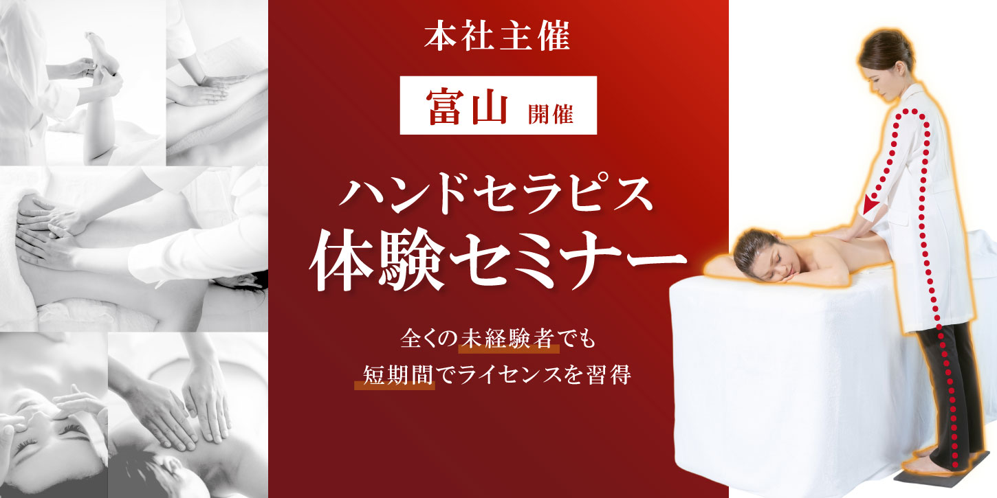 4月012026 【本社主催】ハンドセラピス体験セミナー【富山】 富山県 さあ、あなたも私達と一緒に、ハンドセラピスをはじめよう!!全くの未経験者でも、短期間でライセンスを習得でき、憧れのセラピストに!!全国700店舗に導入された、全く新しい奇跡の施術法をあなたも体験しませんか? ハンドセラピス体験セミナーin富山 開催日時2026年4月1日(水曜日)14:00 ~ 16:00 会場富山県民共生センター サンフォルテ 研修室304 〒930-0805 富山県富山市湊入船町6−7 3階 料金3,000円 ※公式LINEをお友達追加すると550円で体験セミナーに参加できます。 お問い合わせ運営事務局 TEL:052-253-8866(平日9:30~17:00) 備考※人数制限をさせていただきますので、当日参加はお断りさせていただきます。 オールハンドの新しいカタチ 奇跡の施術法「ハンドセラピス®」 「ハンドセラピス®」は東洋医学に則り、身体全体の血流を改善させ自然治癒力を向上させる目的の施術法。従来の方法では結果に時間がかかる東洋医学が、独自に開発したテクノロジーと専門家の監修による手技により画期的な効果が期待できます。 自律神経機能向上に着目した新感覚施術 オールハンドでありながら機器のサポートにより手のひらが精密なセンサーの様に、お客様の身体の状態をキャッチ。 ハンドセラピスは、あらゆる状態に対しても応用が利くこと。様々なシーンで活用できます。どんなメニューとも組み合わせができ、すでにサロンを経営されている方も、今までの技術や機器を無駄にすることなく、さらに効果を高めたり、時間を短縮することができるでしょう。 例)リラクゼーション・フェイシャル・ボディメンテナンス・痩身・スタイルアップ・筋力アップなど セラピストも健康に ハンドセラピスが他の施術と大きく異なるのは、お客さまと触れ合うセラピストにも微弱な電流が流れることです。 自身の健康や美容の増進にも気を使いたいセラピストにとっても、うれしい特徴です。 力を全く必要としない手技なので、年齢を問わず始めることができます。 学院長 <ハンドセラピス美容学院> 学院長 福留 清美 ・株式会社エナジーセラピージャパン 代表取締役 ・一般社団法人日本複合医療臨床研究会 評議員 監修 身体を根本からケアする為、治療家としての知識と技術を最大限に活かし、みなさまの健康のお役に立てるように監修をおこないました。 <手技監修> 鍼灸院かざみどり 院長 戸田悟史 先生 はり師・きゅう師免許・健康運動実践指導者・介護予防運動指導員・アロマアドバイザー <手技監修> 鍼灸治療院くり木 院長 栗木良慎 先生 はり師・きゅう師免許・健康運動実践指導者・介護予防運動指導員・日体協 アスレティックトレーナー・ViPRインストラクターライセンス 医療関連機関、治療院なども注目 ハンドセラピスは医師・看護師をはじめ、あん摩マッサージ指圧師、柔道整復師、カイロプラクターなど医療従事者も注目し、多くの方が取り入れています。 なぜハンドセラピスが選ばれるのか? ハンドセラピスの可能性やビジョンを実体験をご紹介しながら解説します。 多くの方がたった一度の体験でライセンスを取得されています。それは施術を体験した時に「家族にしてあげたい」と思うほど感動するからです。あなたがさがしているのは「ハンドセラピス®」かもしれません。 公式アカウントを「友達追加」してセミナー参加申込