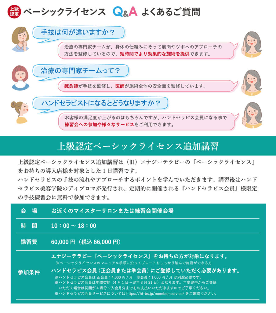 上級認定ベーシックライセンス追加講習は(旧)エナジーテラピーの『ベーシックライセンス』をお持ちの導入店様を対象とした1日講習です。ハンドセラピスの手技の流れやアプローチするポイントを学んでいただきます。講習後はハンドセラピス美容学院のディプロマが発行され、定期的に開催されるハンドセラピス会員様限定の手技練習会に無料で参加できます。